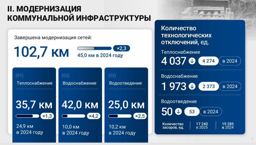 Значительно увеличить объем работ помогла программа «Большой ремонт 74», запущенная в прошлом году по инициативе губернатора Челябинской области Алексея Текслера. Этот момент глава Челябинска Алексей Лошкин осветил сегодня во время доклада о результатах деятельности за 2025 год. За прошлый отчетный период в областном центре смогли значительно усилить работу по замене сетей. Всего удалось модернизировать 102,7 километра коммуникаций, большая часть – 42 километра – пришлось на сети водоснабжения. Также большие объемы по обновлению теплосетей – заменили более 35 километров. Для сравнения: в 2024 году модернизировали 45 километров коммуникаций. Так что объемы увеличились значительно. Как отметил Алексей Лошкин, такую масштабную работу в сфере ЖКХ удалось провести благодаря проекту «Большой ремонт 74», который запустили в 2025 году по инициативе губернатора Алексея Текслера. В завершении выступления глава Челябинска поделился приоритетными направлениями работы в текущем году – и модернизаци