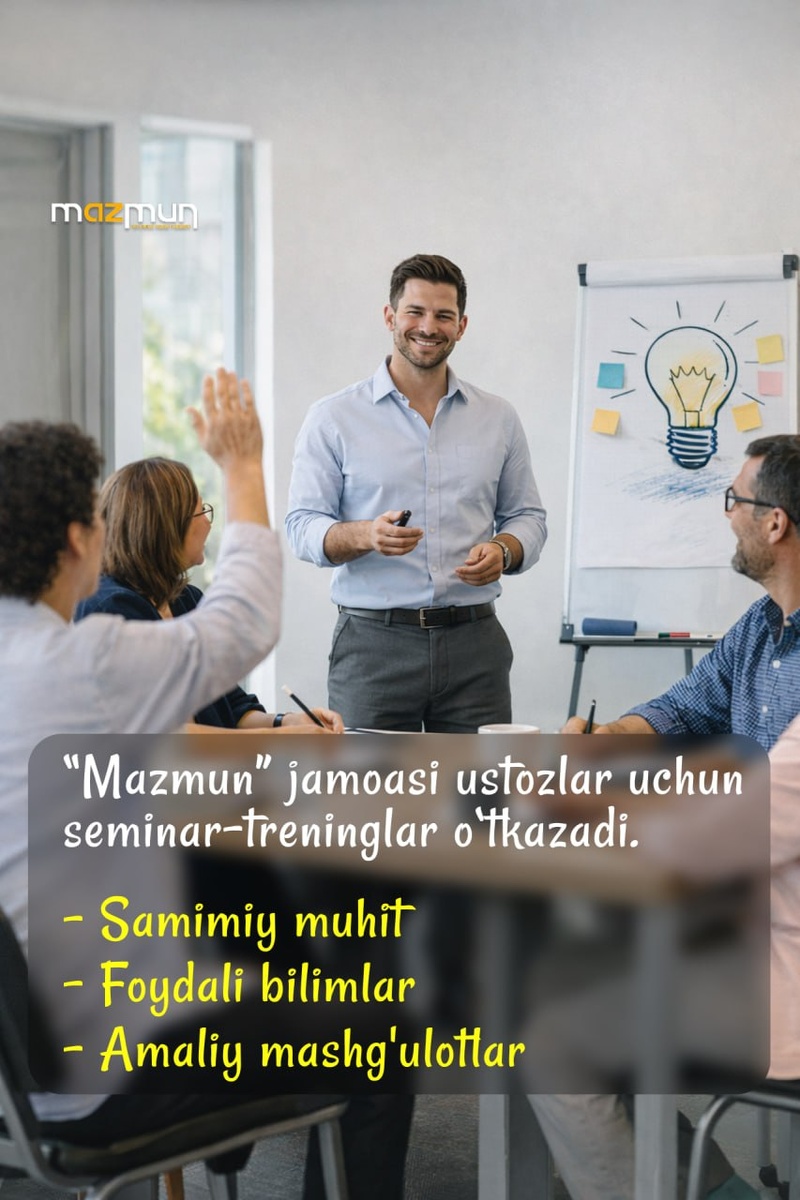! Yaxshi dam olayapsizlarmi? Kimlardir allaqachon ishni ham boshlab yuborgandir! ❔ Ta’til paytida ustozlar shunchaki dam olishi kerak deb o‘ylaysizmi? Bu albatta to‘g‘ri, lekin aynan shu vaqtni ustozlarga yangi kuch, yaxshi kayfiyat va o'zgacha motivatsiya beradigan foydali vaqtga aylantirsa ham bo‘ladi. Agar siz ustozlaringizning charchog‘ini chiqarishni, ularni biroz “uyg‘otishni”, jamoaviylikni oshirishni, foydali bilimlar berishni va yangi chorakka yanada ko‘tarinki ruhda tayyorlashni xohlasangiz, biz bu borada sizga yordam bera olamiz. “Mazmun” jamoasi ustozlar uchun seminar-treninglar o‘tkazadi. Seminarlarimiz samimiy, foydali, amaliy formatda bo'lib o'tadi. 🛫 Agar qiziq bo'lsa hoziroq aloqaga chiqing: @mazmunadmin 😉Mazmun - doimiy rivojlanishni xohlovchi ustozlar uchun!
