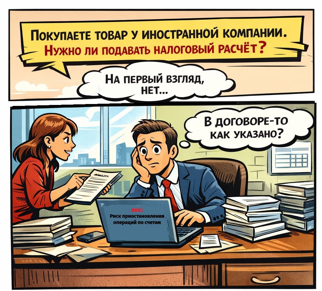 Нужно ли подавать Налоговый расчёт в ФНС, если вы не платили за услуги, а просто покупали товар у иностранной компании? На первый взгляд кажется, что нет. Обычно Налоговый расчёт сумм доходов, выплаченных иностранным организациям, связывают с более очевидными случаями: дивиденды, роялти, доходы по ценным бумагам, международная перевозка и другие выплаты, прямо упомянутые в статье 309 НК РФ. Но дальше начинается менее очевидный вопрос. 👉🏻Покупка товара у иностранной компании — это тоже выплата дохода иностранной организации. И здесь, по мнению ФНС, важно смотреть не только на сам факт оплаты, но и на момент перехода права собственности на товар. Если право собственности перешло к российскому покупателю за пределами РФ, то территорией реализации Российская Федерация не признается, и Налоговый расчёт не подается. А если право собственности переходит на территории РФ, то обязанности по уплате налога не возникает, но может возникнуть обязанность по подаче Налогового расчёта. На пра