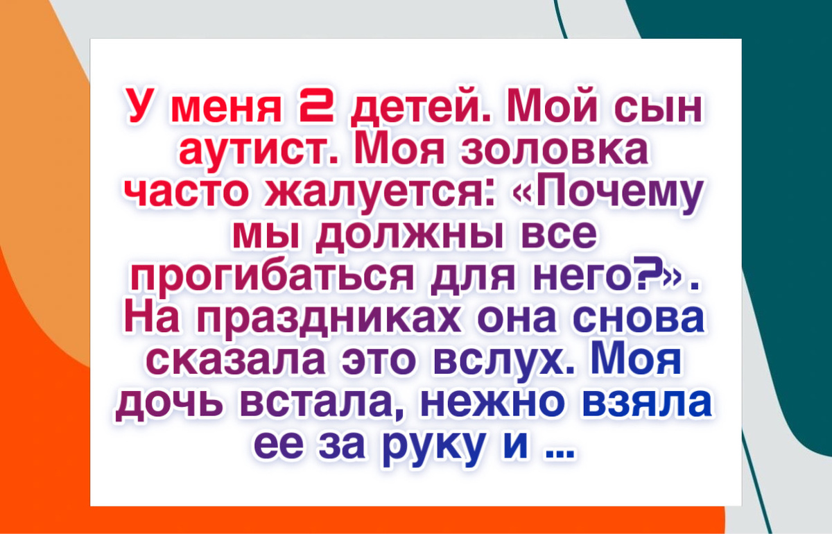“У меня двое детей: сыну 8 лет, дочери 10. Мой сын аутист и не разговаривает. Моя золовка постоянно жаловалась: «Почему мы должны под него подстраиваться? Он портит все семейные праздники». На праздниках она снова сказала это, достаточно громко, чтобы все услышали. Моя дочь встала из за стола, подошла к тете, мягко взяла ее за руку и сказала: «Тетя, он самый добрый человек, которого я знаю. Просто он показывает это по другому. Может, если бы ты действительно обращала внимание, ты бы это увидела». За столом стало очень тихо. А потом дочь со слезами на глазах добавила: «Он ничего не портит. Это ты портишь. Он не выбирал, каким родиться, а ты выбираешь быть злой». Лицо золовки покраснело, она расплакалась и вышла. Через час она вернулась и извинилась перед всеми, особенно перед моим сыном. Она призналась, что просто боялась его, потому что не понимала, и слова моей дочери заставили ее понять, насколько она была жестока».”