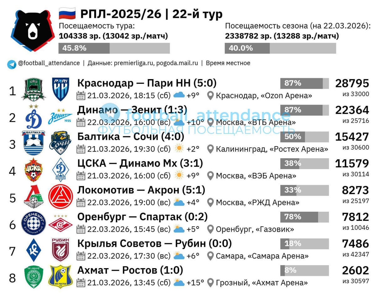 Средняя посещаемость 22-го тура РПЛ-2025/26 составила 13042 зрителя