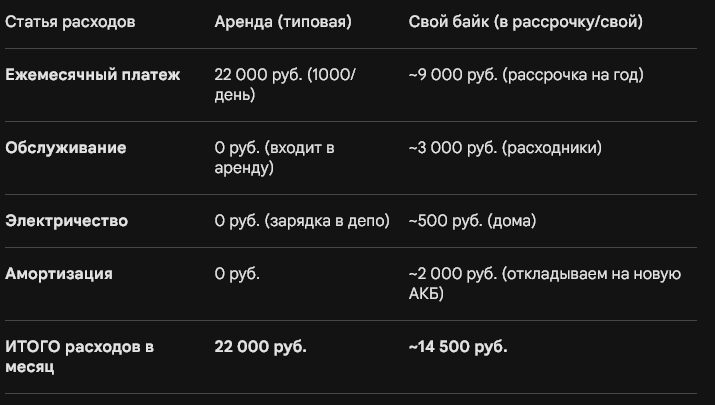 - Свой байк: Окупается за 3–4 месяца активной работы.
