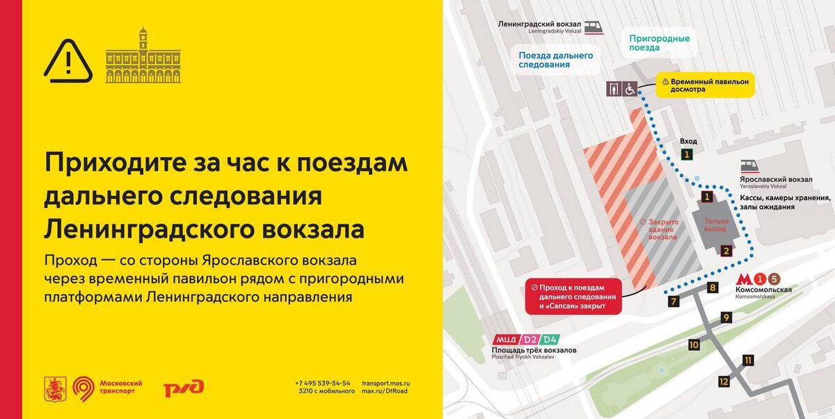 В настоящее время проводятся строительные работы, связанные с благоустройством территории, созданием парковок и подключением вокзала к инженерным коммуникациям. В связи с этим проход на платформу с 24 марта осуществляется через временный досмотровый павильон, расположенный со стороны Ярославского вокзала и метро «Комсомольская». Для маломобильных граждан оборудован пандус. Сориентироваться на месте помогут навигационные стойки и дежурные сотрудники вокзала.