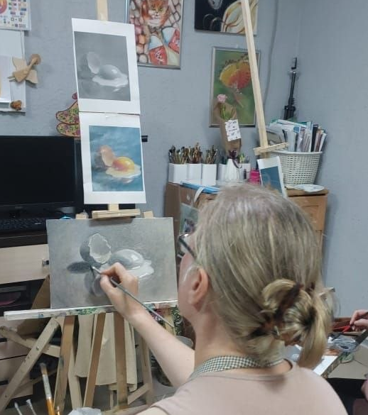 Я копировала небольшую работу современного автора с помощью постепенного накладывания прозрачных слоев один на другой. Композиция довольно простая, потому что это учебная работа. Сначала перенесла рисунок на холст, это заняло совсем немного времени, сама графика несложная. Потом покрыла холст тонким слоем жжёной умбры -это называется имприматура. Она нужна не для цвета, а для того, чтобы задать общее ощущение тона и убрать ярко-белый цвет. Слишком «кричащая» основа мешает видеть реальные отношения света и тени. После небольшого перерыва (масло должно чуть «схватиться») мы начали гризайль -работу чёрно-белой краской. Задача передать точность тонов (где светлее, где темнее). На втором занятии я начала работать с цветом и перекрыла всю гризайль. Цвет еще сырой и я где-то не попала в оттенки, где-то мазки были слишком заметны, резкие переходы. И это нормально, потому что лессировка про постепенное наращивание цвета слоями. Вот здесь стало интереснее, начала работать прозрачными слоями:
