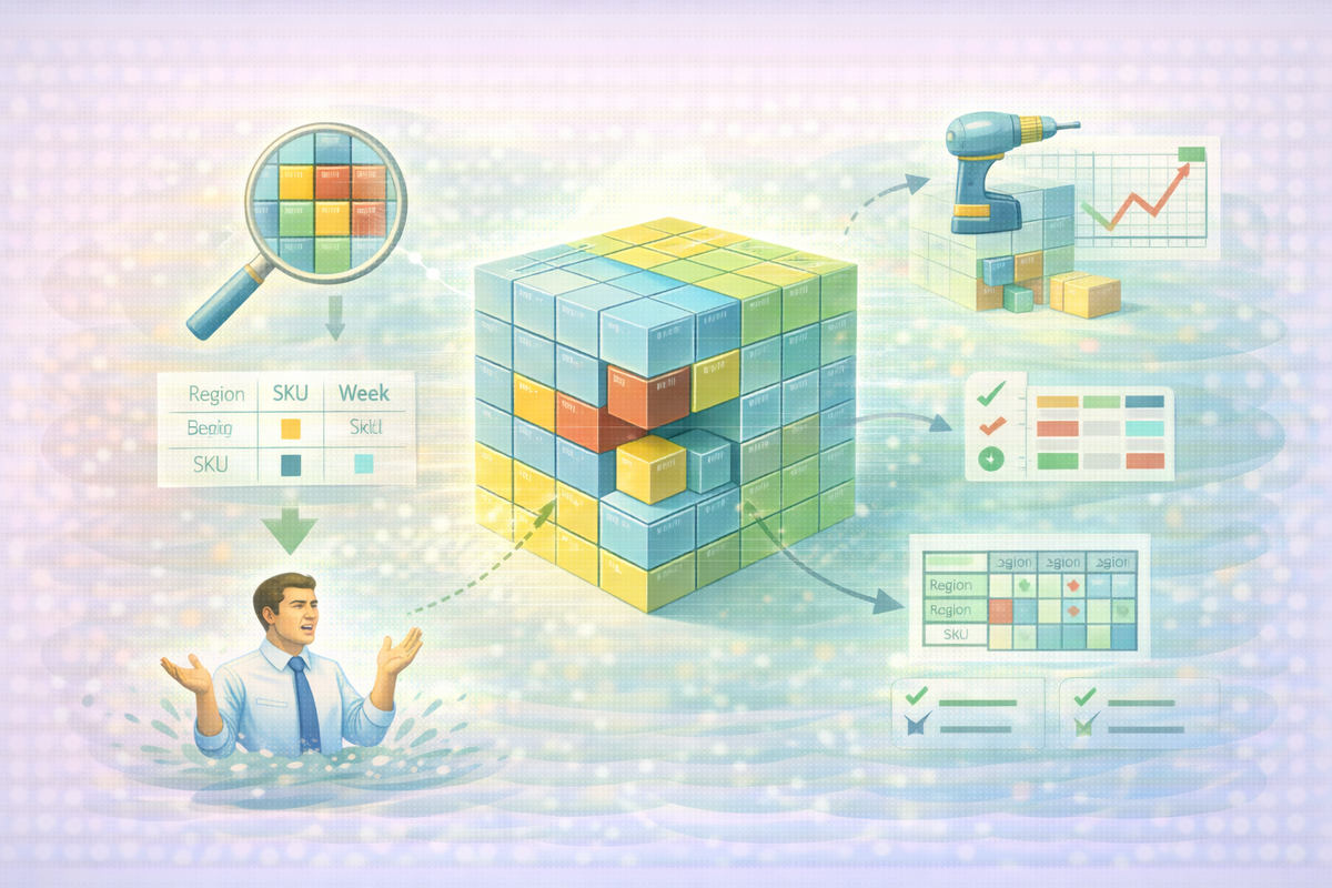 Когда бизнес просит «срезы по региону/сети/SKU/дистрибьютору/неделе», многие пытаются делать это в Excel. Пока данных мало — работает. Когда данных много — начинает тормозить, ломаться и превращаться в копии файлов «финал_финал2». Здесь появляется OLAP. Термины: