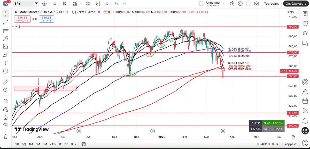Сейчас важно понаблюдать, был ли это лишь технический отскок, и дальше мы можем снова протестировать эти же уровни (либо пойти еще ниже), учитывая, что $S5TW немного подзарядился и может опуститься ниже. Также для всех важных приборов скользящие сверху могут выступить сопротивлением. А при движении будем последовательно нагружать портфель и не забывать защищать капитал. #spy #технический_анализ #америка #трейдинг_сша #фондовый_рынок #обзор #вывод #qqq #vix #smh #mags #xlk #ixic