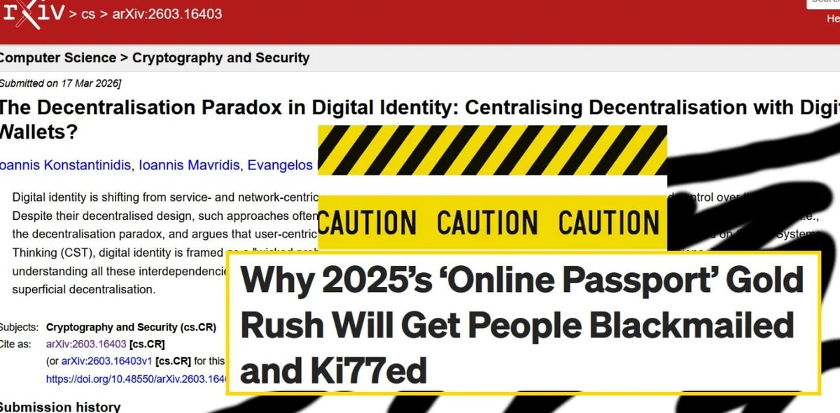 Заключается оно в том, что чем больше система цифровой идентификации пытается устранить централизованное управление (переходя к пользовательским кошелькам, блокчейну, самоуправляемым идентификаторам), тем больше она вновь вводит централизованные компоненты в других формах. 📎 https://arxiv.org/abs/2603.16403 Т.е. Технически данные могут храниться у пользователя (децентрализация). Но инфраструктура доверия (кто признается официальным эмитентом, какие кошельки сертифицированы, какие блокчейны считаются авторитетными) остаётся под контролем правительств, консорциумов или корпораций (Apple, Google и др.). В результате возникает не «отсутствие доверия» (trustlessness), а лишь его перераспределение — часто с концентрацией рисков на самом слабом звене (например, на стартапах, которые проводят верификацию) и с перекладыванием ответственности за компрометацию на конечного пользователя. 📱 Telegram | 🌐 ВК | 📲 MAX