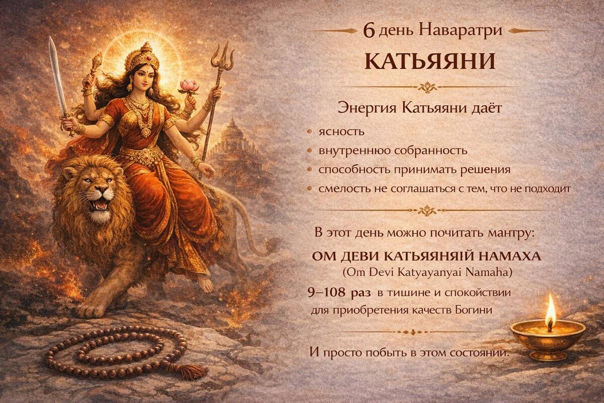 Про силу, которая появляется, когда Вы перестаёте терпеть Шестой день посвящён Богине Катьяяни — одной из самых мощных форм Дурги. 🌿 Небольшая легенда Считается, что Катьяяни появилась, когда боги больше не могли справиться с демоном. Их силы не хватало. Тогда из их энергии родилась Она — собранная, сильная, абсолютно уверенная. И именно она сделала то, что никто до неё не смог. 👉 уничтожила то, что разрушало порядок 🌱 Что даёт энергия Катьяяни - ясность - внутреннюю собранность - способность принимать решения - смелость не соглашаться с тем, что не подходит 🕉 Мантра дня — Катьяяни Для Богини Катьяяни традиционно читают мантру: ОМ ДЕВИ КАТЬЯЯНЯЙ НАМАХА (Om Devi Katyayanyai Namaha) ✨ Как читать — в спокойном состоянии — можно утром или вечером — можно любое количество от 9 до 108 раз