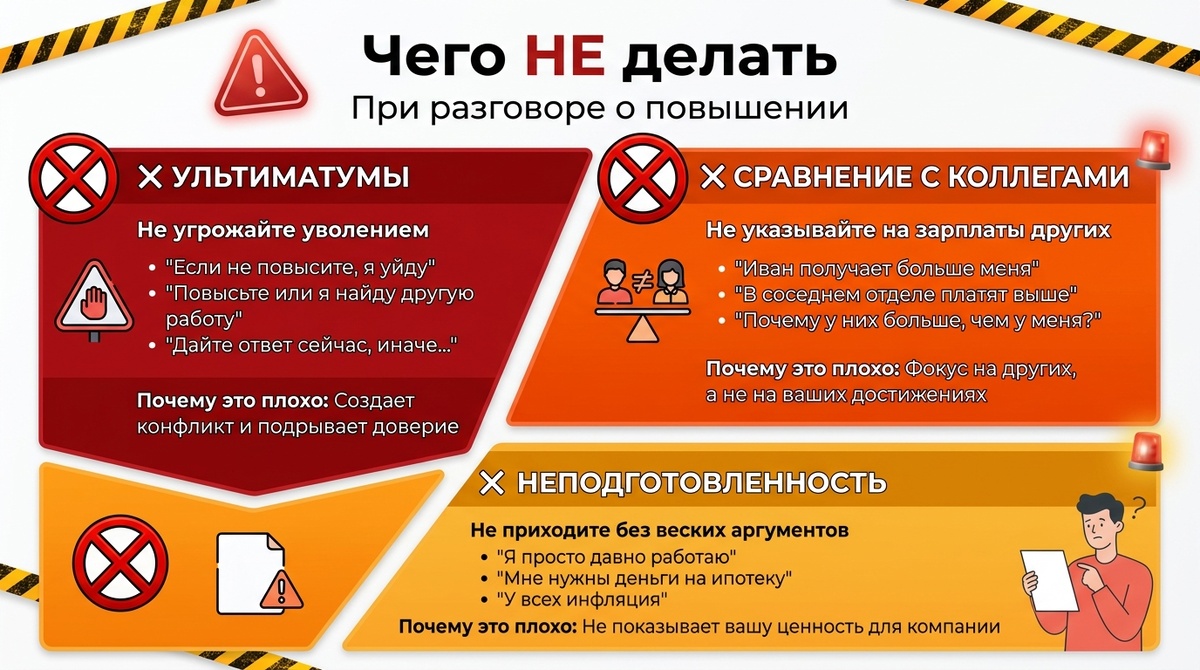 Провальные приёмы — ультиматумы без оффера, сравнения с коллегами и «прошу за стаж». Не давите на жалость и не приходите без цифр и суммы. Держите деловой тон, аргументируйте пользой и фиксируйте договорённости письменно.