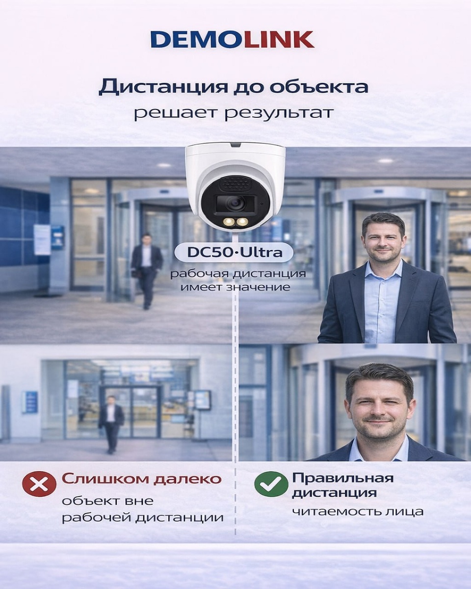 Есть ситуации, когда система видеонаблюдения формально работает,но не решает задачу. Камера установлена. Изображение есть. Но нужной информации в кадре — нет. В чём проблема Объект находится за пределами рабочей дистанции камеры. Он попадает в кадр,но занимает слишком малую часть изображения. В результате: — детали теряются — лицо не фиксируется — событие нельзя использовать Частая ошибка — пытаться «добавить качество» через разрешение: 4 Мп → 5 Мп → 8 Мп Но камера не изменяет масштаб сцены. Она лишь записывает то, что уже есть в кадре. 📌 Если объект занимает 5–10% кадра — даже высокая матрица не сделает его читаемым. Что на самом деле влияет Ключевой параметр — это не разрешение, а: 📏 дистанция до объекта Именно она определяет: — размер человека в кадре — количество деталей — возможность идентификации Где это критично Такая ошибка чаще всего возникает в зонах: 🚪 входы 🏢 холлы 🛂 контрольные точки 🚶 проходные зоны Где важно не просто видеть движение, а фиксировать ч