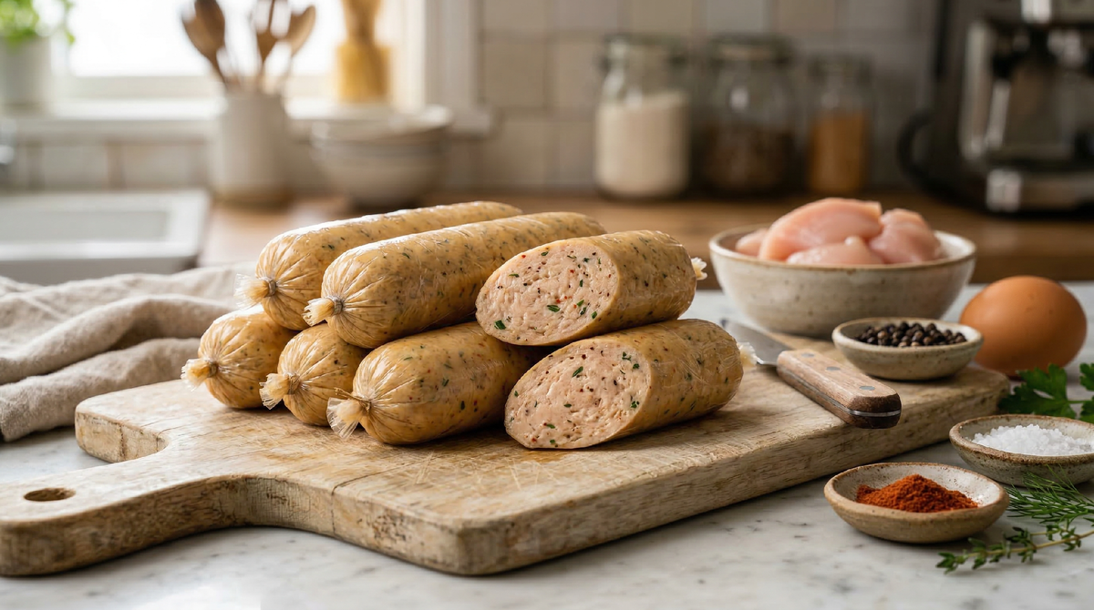 Тот, кто впервые пробует домашнюю куриную сосиску, обычно замирает на секунду, потому что вкус оказывается неожиданно другим. Не таким ярким и агрессивным, как у магазинной, а более тонким, чистым, глубоким. Чувствуется именно курица — её натуральный, чуть сладковатый вкус, обогащённый специями. Чеснок раскрывается мягко, мускатный орех добавляет едва уловимую тёплую ноту, паприка даёт лёгкий оттенок, не перебивая основу.