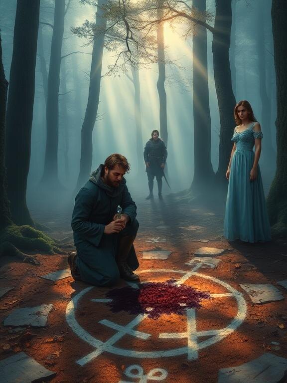 Элиар и Ренар прибыли на место к закату. Поляна действительно выглядела зловеще: вытоптанный круг диаметром шагов в десять, странные символы, начертанные на земле, тёмные пятна вокруг, будто кто‑то пролил жидкость.
