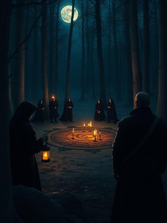 Ночь выдалась тёмной и безлунной. Лес шумел под порывами ветра, и каждый скрип дерева казался шёпотом неведомых сил. На главной поляне леса, окружённой вековыми дубами, готовились к «великому обряду». Барон Орвин лично следил за приготовлениями. Актёры в чёрных плащах расставляли факелы, размечали круг углём, разливали тёмную жидкость, похожую на кровь. — Помните, — шипел барон, — шепчите неразборчиво. Двигайтесь медленно. Пусть все увидят силу тьмы. — А если кто‑то не испугается? — спросил один из актёров. — Испугаются, — усмехнулся Орвин. — Страх заразителен. Завтра к вечеру половина округа соберёт вещи. Тем временем у опушки леса трое в простых плащах паломников осторожно пробирались к поляне. Алхимик, рыцарь и герцогиня сменили одежду, чтобы смешаться с толпой. — Будьте осторожны, — шептала Ирена. — Орвин не должен нас узнать. — Я записал все места, где спрятаны реквизиты, — тихо сказал Элиар. — Вот здесь, — он показал на карту, — запас угля. Здесь — кувшины с соком бузины. И вот