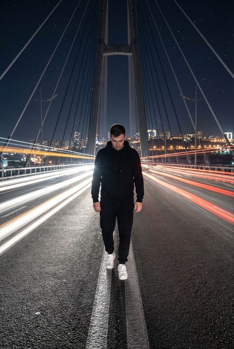 От подписчицы @ANST2926 Критически важно точно сохранить черты лица мужчины с загружённого фото. На изображение мужчина идет по русскому мосту, мужчина в чёрной толстовке, черных спортивных штанах и белых кроссовках, идет опустив немного голову по двойной сплошной, ракурс прямой чтобы было видно Русский мост, на фоне ночь, городские огни, по мосту рядом с мужчиной видно много фар проезжающих мимо машин, звездное небо , выдержка 0,5 соотношение сторон 2:3, высокая детализация, он должен находится в центре композиции Печальная атмосфера брошенности и отчаяния Если тормозит Telegram, делаю в русском веб-сервисе gptunnel (промокод на скидку 75% PROMPT1_75 ) Если Telegram не тормозит делаю в Telegram боте Syntx Наша группа VK - если нет сил сидеть в ТГ. #мужские@prompt1_ru