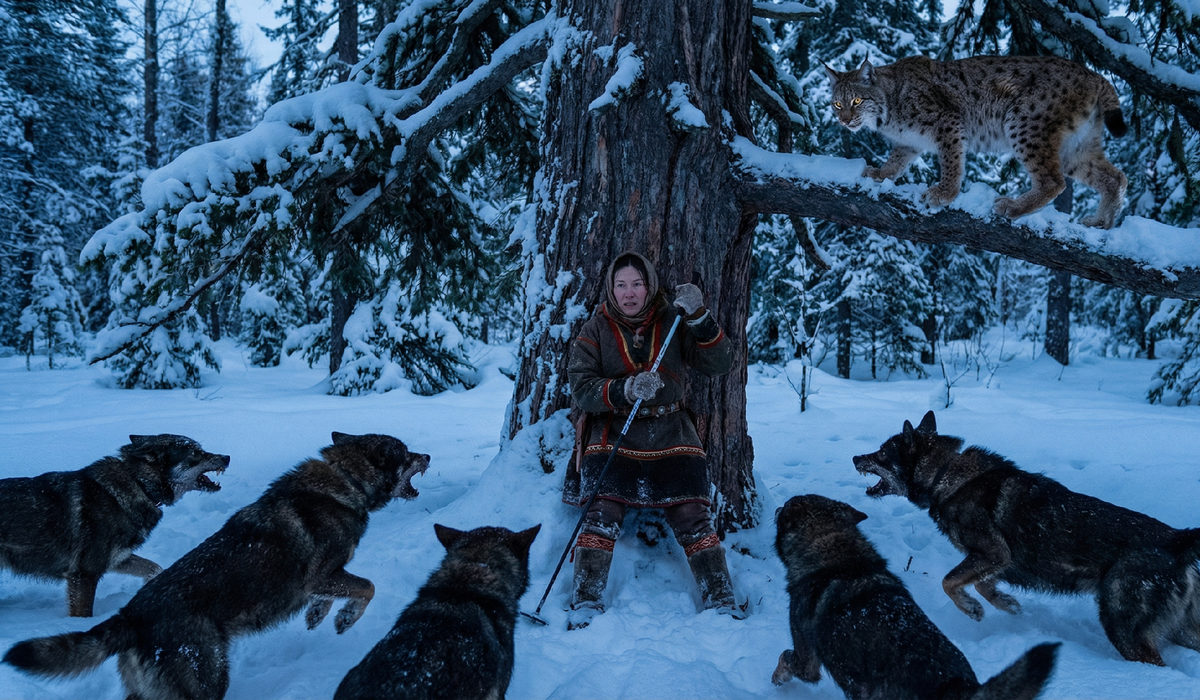Рысь не смотрела на неё. Все её внимание было приковано к оставшимся четырем собакам. Она подняла голову и издала звук, от которого кровь застыла в жилах, — пронзительный, вибрирующий вопль дикой кошки, заявляющей свои права на эту территорию и эту добычу. Она выгнула спину, шерсть встала дыбом, делая её еще огромнее.