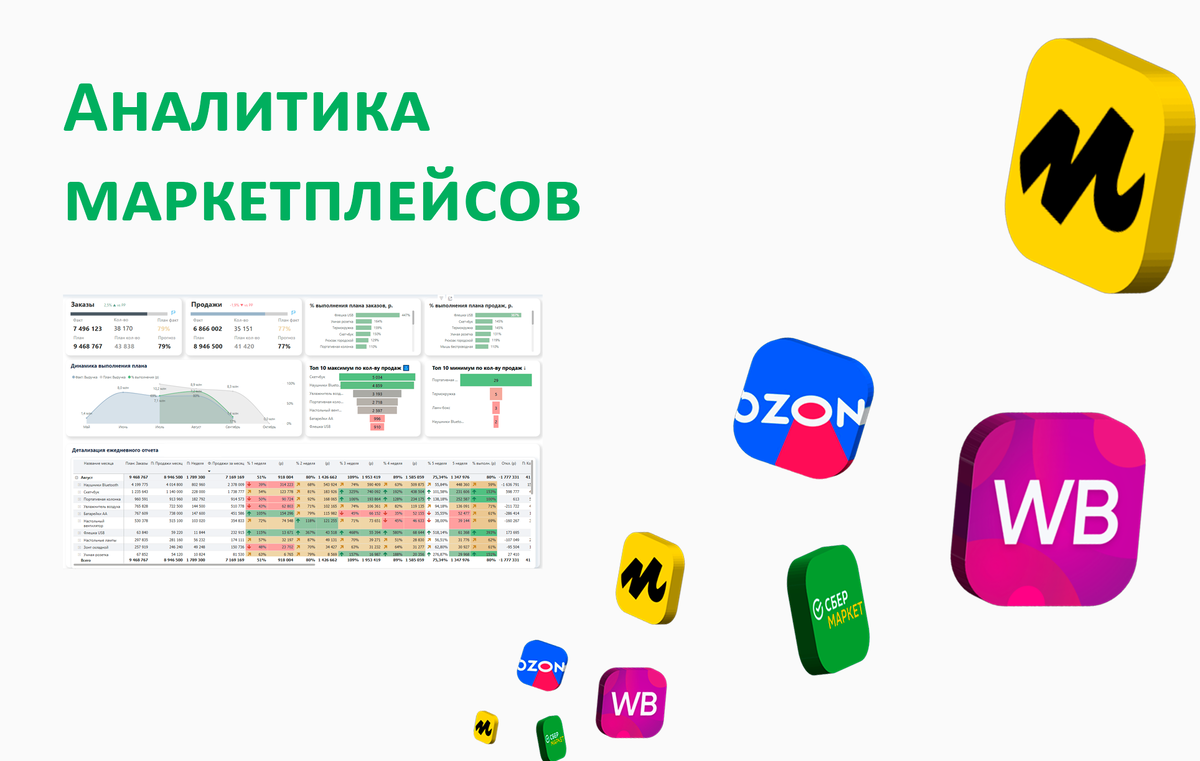 Сегодня маркетплейсы — обязательный канал продаж для крупных ритейлеров и производителей. Wildberries, OZON, Яндекс Маркет, ЛЭТУАЛЬ и другие площадки приносят значительную долю выручки при налаженной работе с МП. Но с ростом продаж усложняется и анализ показателей эффективности. Если у вас: без консолидации всех данных вам будет сложно увидеть полную картину бизнеса, и стандартными онлайн-сервисами аналитики тут не обойтись. WB, Ozon, Яндекс.Маркет, 1С, CRM и сторонние сервисы (MpStats) демонстрируют разные показатели
