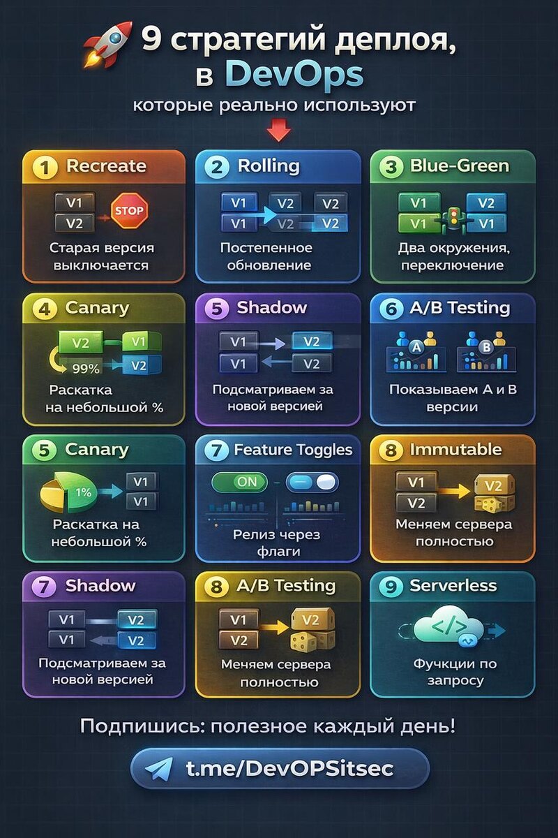 Современные команды выбирают стратегию релиза не «по привычке», а исходя из риска, бюджета и требований к uptime. Вот база, которую нужно понимать: 1⃣ Recreate Deployment Старую версию полностью останавливают, потом запускают новую ➝ Плюсы: просто, нет конфликтов ➝ Минусы: есть downtime ➝ Когда использовать: внутренние сервисы, простые системы 2⃣ Rolling Deployment Обновление происходит постепенно, по инстансам ➝ Плюсы: без даунтайма, плавный rollout ➝ Минусы: одновременно работают разные версии ➝ Где используется: Kubernetes, Docker 3⃣ Blue-Green Deployment Два окружения: старое (Blue) и новое (Green) Переключение трафика происходит мгновенно ➝ Плюсы: быстрый rollback, безопасный релиз ➝ Минусы: дорого, сложнее с базой 4⃣ Canary Deployment Сначала выкатываешь на небольшой % пользователей ➝ Плюсы: раннее обнаружение проблем ➝ Минусы: сложная маршрутизация и мониторинг ➝ Используют: Google, Netflix 5⃣ Shadow Deployment Продакшн-трафик дублируется на новую версию ➝ Плюсы: тест на р