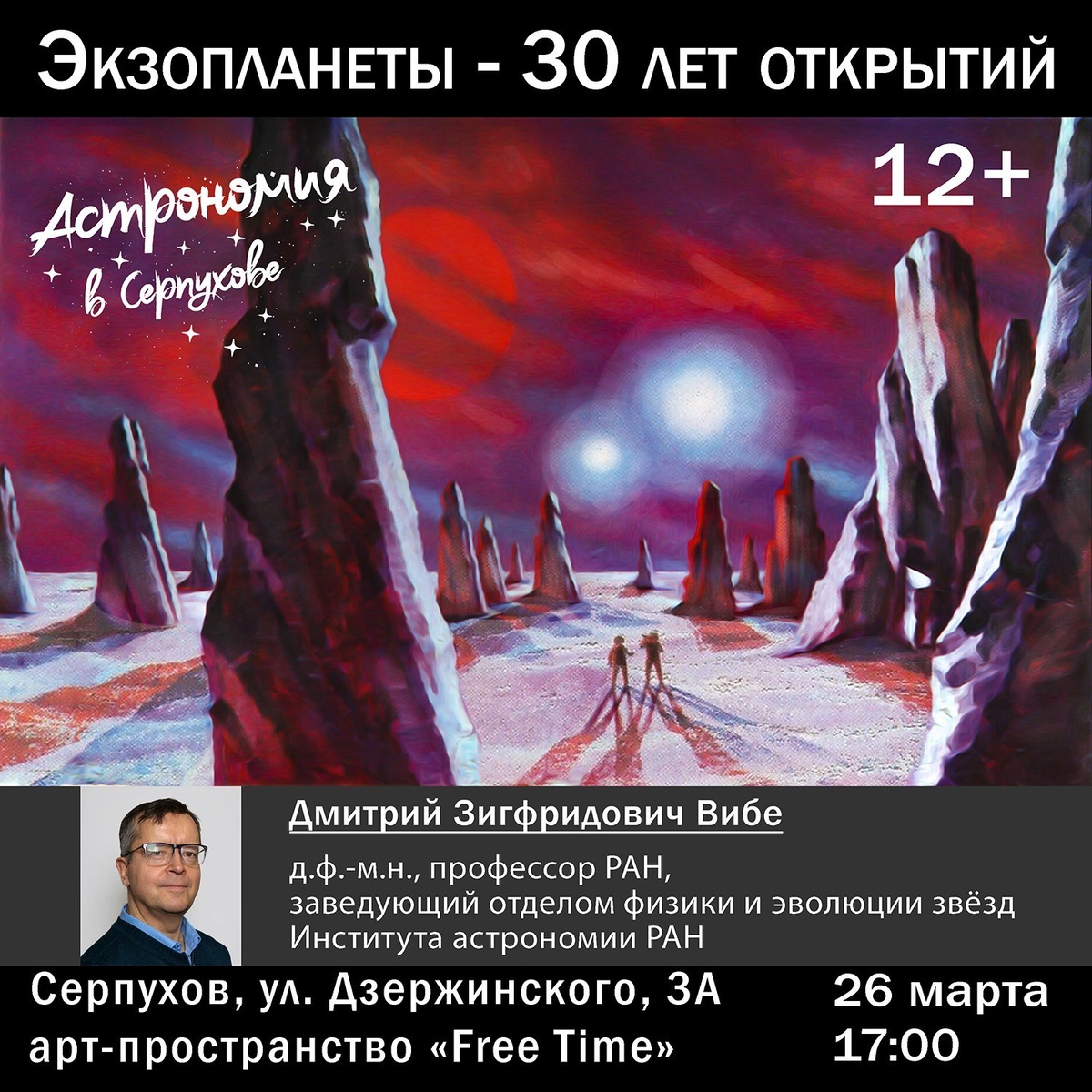 ✨ Лекция о том, как развивалась разведка планет у других звёзд (экзопланет) На лекции профессора РАН Дмитрия Зигфрида Вибе слушатели узнают: ✅ Общее количество открытых экзопланет, их типы и расположение. ✅ Итоги исследований последних 30 лет: природа экзопланет и нерешенные загадки. ✅ Инструменты и методы изучения экзопланет ✅ Возможности обнаружения потенциально пригодной для жизни планеты («Земля 2.0»). 👉Лекция продлится 1.5 часа и пройдет в непринужденной атмосфере 🚫 Возраст: 12+ 📆 26.03.2026 🕒 17:00 🏢 Арт-пространство Free time 📍 г. Серпухов, ул. Дзержинского, д. 3А 💰 Вход свободный❗️ ⭐Поддержать канал голосом 💰 Канал Вакансии Серпухова ✅ Мероприятия Серпухов https://dzen.ru/id/66f01c6eb4c6fe60c9ca1608 https://vk.ru/serpukhov_events http://dzen.ru/serpukhov_events