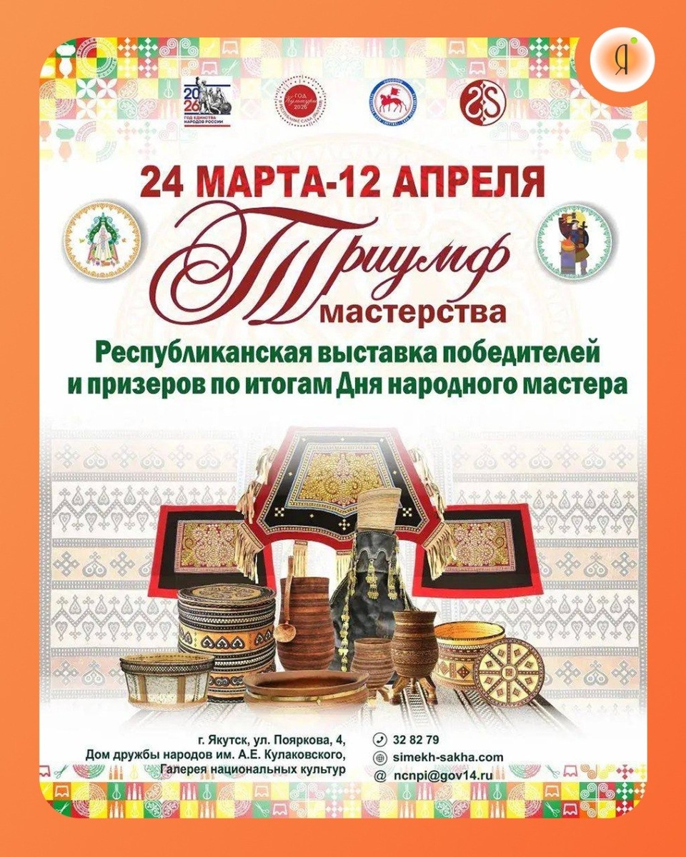» 24 марта в 15.00 ч. в Якутске откроется выставка, демонстрирующая работы победителей и призёров самого яркого мероприятия Дня народного мастера-2026 — XVI Республиканской выставки-ярмарки «Якутия Мастеровая». Уникальная экспозиция развернёт перед зрителем настоящую энциклопедию народных художественных промыслов, где в одном месте собраны лучшие образцы традиционного и современного искусства Якутии. Жители и гости столицы увидят произведения, получившие высшие оценки жюри и признание публики. Эти работы представляют собой не просто ремесленные изделия, а подлинные произведения искусства, отражающие богатство культурного кода Республики Саха (Якутия). 📍Дом дружбы народов им. А.Е. Кулаковского, 1 этаж, Галерея национальных культур 🗓️ с 24 марта по 12 апреля, с 10.00 до 18.00 (перерыв 13.00–14.00) ☎️ 32-82-79 Online Якутия | Ждем вас в МАХ