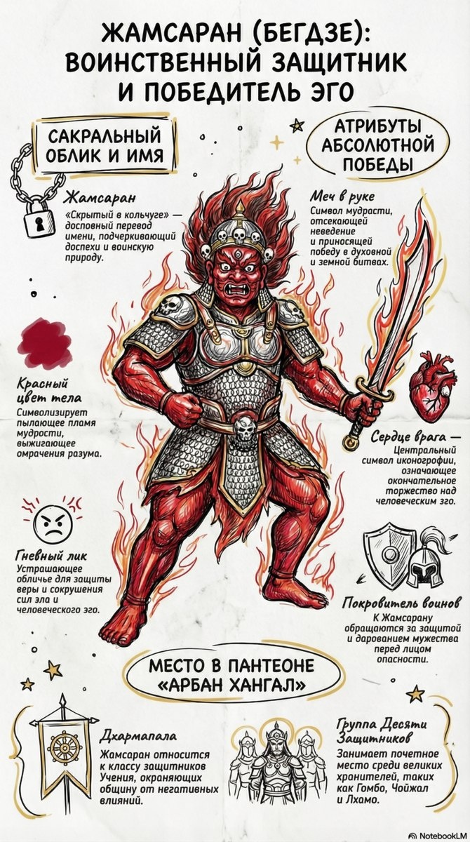 Имя Жамсаран дословно переводится как «Скрытый в кольчуге», что подчеркивает его воинскую природу. Он относится к классу защитников-дхармапал, охраняющих общину от негативных внешних воздействий. Красный цвет его тела символизирует пылающее пламя мудрости, выжигающее омрачения человеческого разума. Главными атрибутами Жамсарана являются меч в руке, отсекающий неведение, и сердце врага, которое служит центральным символом победы над человеческим эго. Его гневный лик предназначен для устрашения сил зла и сокрушения препятствий на пути Учения. Жамсаран традиционно считается покровителем воинов: к нему обращаются за защитой и дарованием мужества перед лицом опасности. Канал нашей студии https://t.me/chimitdorzhi_studio
