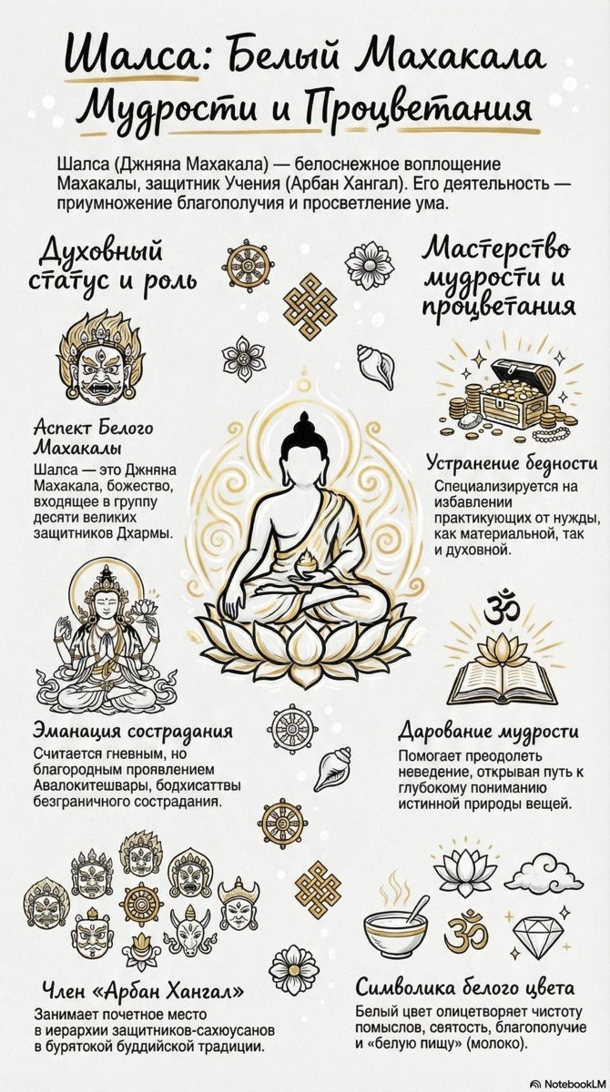Шалса (Джняна Махакала) — белоснежное воплощение Махакалы, входящее в группу Арбан Хангал. Он считается гневным, но благородным проявлением бодхисаттвы Авалокитешвары. Белый цвет божества олицетворяет чистоту помыслов, святость, благополучие и «белую пищу» (молоко). Духовный статус и роль: Устранение бедности: Шалса специализируется на избавлении практикующих от нужды — как материальной, так и духовной. Дарование мудрости: божество помогает преодолеть неведение, открывая путь к глубокому пониманию истинной природы вещей. Мастерство процветания: деятельность Шалсы направлена на приумножение благополучия и просветление ума. Занимая почетное место в иерархии защитников-сахюусанов, он помогает преодолеть препятствия, мешающие гармоничному развитию личности и накоплению добродетелей. Канал нашей студии https://t.me/chimitdorzhi_studio