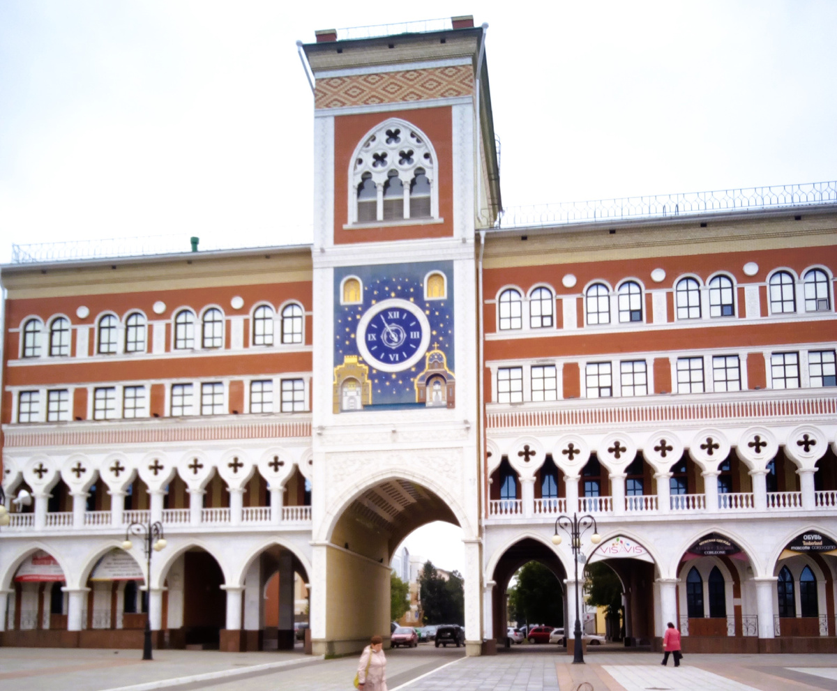 Перед зданием - Памятник епископу Марийской епархии священномученику Леониду. Элементы декора остальной части здания заимствованы у дворца Дукале, расположенного южнее и выходящего главным фасадом на Лагуну. Вдали конный памятник И.А. Оболенскому-Ноготкову первому воеводе царева города на Кокшаге И.А. Оболенский-Ноготков служил на государевой службе воеводой в Казани (1576 г.), Серпухове (1579-1580 гг.), Нижнем Новгороде (1583-1584 гг.).