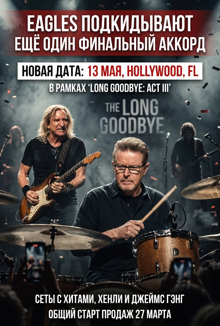 Eagles не дают фанатам выдохнуть. Только что объявили новую дату в рамках «Long Goodbye: Act III» — 13 мая в Hollywood, FL, на Hard Rock Live. Вставили между Нэшвиллом и Арлингтоном, будто специально, чтобы никто не расслаблялся. После рекордной резиденции в Sphere в Лас-Вегасе (уже больше 50 шоу — дольше всех в истории зала) группа продолжает растягивать прощальный тур. Начинается всё в сентябре 2023-го, даты добавляют по чуть-чуть: «Мы хотим, чтобы каждый фанат успел нас увидеть на этом финальном круге». Билеты на новый концерт — пре-сейл уже завтра в 10 утра по восточному, общий старт 27 марта. В сетах — все хиты, плюс «The End of the Innocence» Хенли и даже «Funk #49» от Джеймса Гэнга. Плюс в воздухе висит расширенное переиздание «One of These Nights» 1975 года с неизданным живым концертом оригинального состава. Классика, которая не отпускает. Кто ждал, что легенды будут так упорно прощаться — тот теперь может ловить момент __