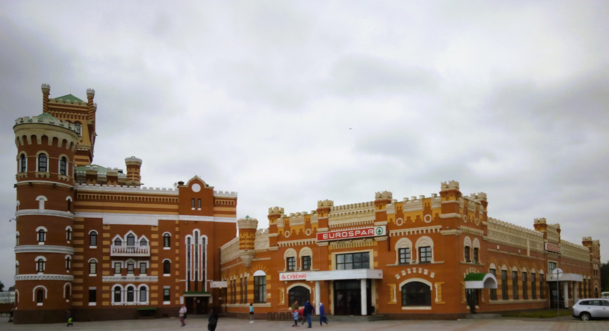 Светлые стены с тёмно-коричневыми оконными амбразурами напоминают старинные средневековые замки рыцарей. Перед зданием театра расположен каскад фонтанов и бассейнчиков. «12 апостолов» — уникальный архитектурный комплекс с часами в Йошкар-Оле, одна из главных достопримечательностей города. Сюжет комплекса основан на евангельской истории о входе Господнем в Иерусалим. За Иисусом Христом на белом ослике следуют его ученики: Андрей Первозванный, Иуда Искариот, Пётр, Симон Кананит, Иоанн Богослов, Фаддей, Яков Заведеев, Иаков Алфеев, Матфей Евангелист, Варфоломей, Фома Неверующий, а также Филипп из Вифсаиды.