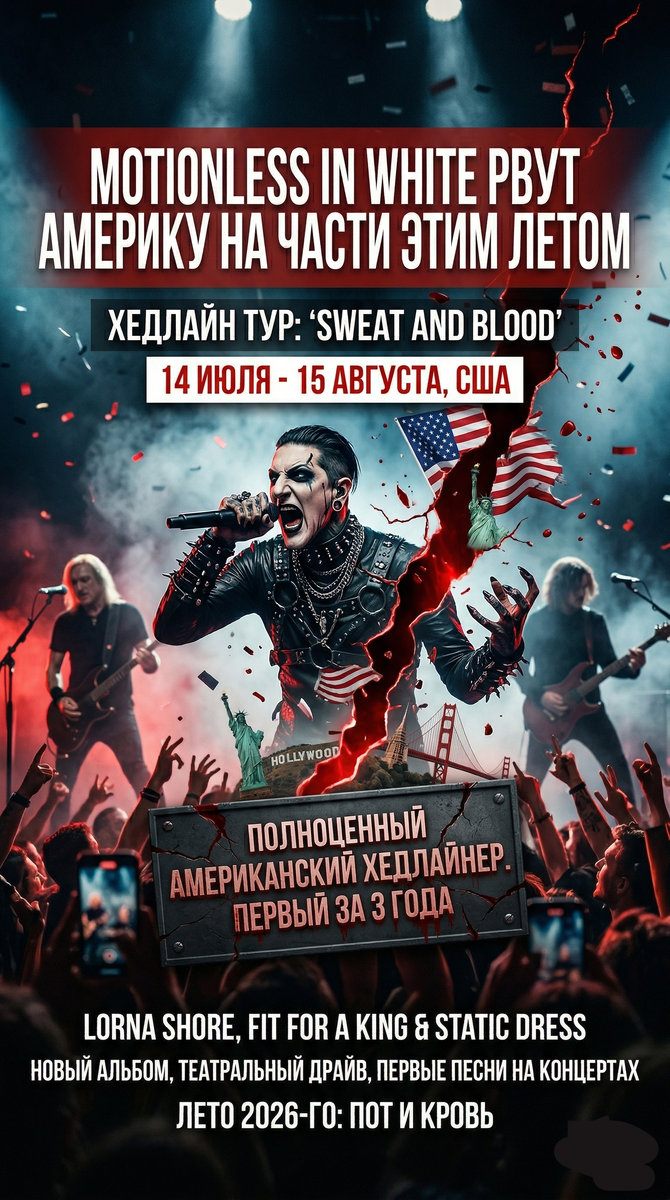 Motionless in White наконец-то возвращаются с полноценным американским хедлайнером. Тур «Sweat and Blood» стартует 14 июля в Бриджпорте и заканчивается 15 августа в Стерлинг-Хайтс. Первый раз за почти три года они возглавили тур по Штатам — и сразу с размахом: Red Rocks в качестве хедлайна, плюс остановка на Inkarceration Festival. В поддержке — Lorna Shore, Fit for a King и Static Dress. Группа прямо в пресс-релизе заявила: «Мы целимся в луну, чтобы отпраздновать возвращение. Ждём, когда наконец покажем первые песни с нового альбома». После трёх лет ожидания фанаты получат свежак прямо на концертах. Metalcore с театральным драйвом, который всегда умел превращать зал в адреналиновый цирк. Если кто-то думал, что Motionless затихли — вот вам доказательство обратного. Лето 2026-го уже пахнет потом и кровью