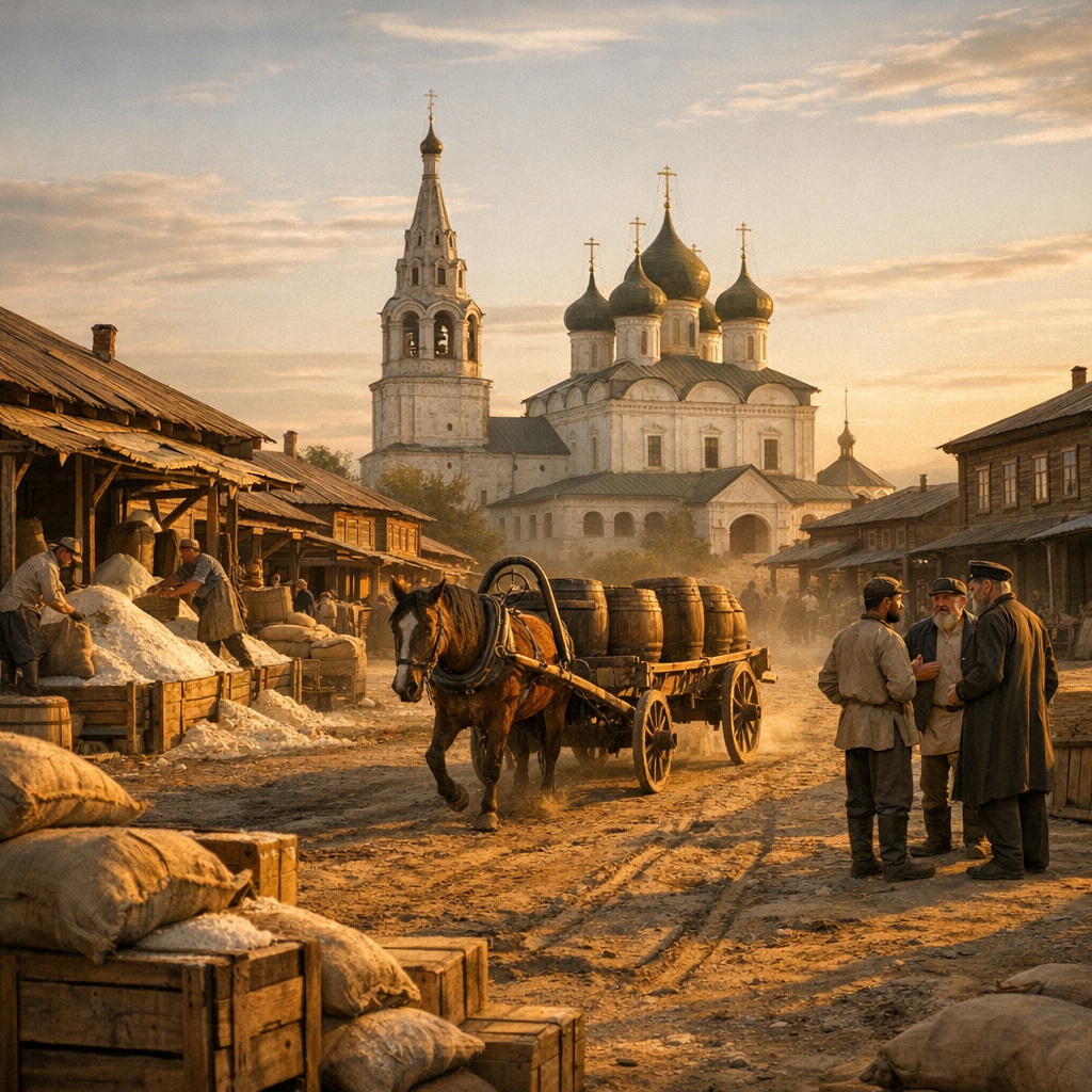 В Балахне XIX века невозможно сразу понять, что именно здесь главное. На первый взгляд — тихие улицы, деревянные дома, спокойное течение жизни. Но стоит задержаться, и появляется ощущение, что под этим спокойствием скрывается нечто более плотное, почти осязаемое. Воздух здесь кажется тяжёлым не из-за погоды. В нём есть едва уловимая плотность, как будто сам город пропитан чем-то, что невозможно увидеть. И только потом приходит понимание — это место жило солью, и она осталась в нём даже тогда, когда её не видно. И чем дольше смотришь, тем яснее становится: Балахна не просто существовала рядом с этим промыслом — она стала им. В Балахне нет ощущения резкого роста или внезапного появления. Всё здесь складывалось постепенно, слой за слоем, как будто сам город собирался из повторяющихся действий. Улицы не выглядят строго спланированными. Они идут так, как будто сначала появились тропы, потом дороги, и только потом — дома. В их линиях нет стремления к симметрии, но есть внутренняя логика. П