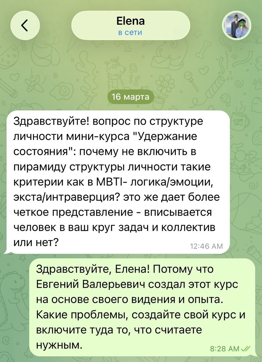 ". У нас вполне эмотивная команда. Однако, не всегда клиентоориентрованная. Когда нет? Когда человек, задавая вопрос, оценивает материал. Если хотите спросить: "Что думаете про систему MBTI?" То вопрос так и будет звучать - что думаете. А не с точки зрения оценочного суждения, - что бы такого нам было лучше вставить в программу. Быть недовольным ответом и бежать жаловаться на чат ОС "начальству" в личку. Если хотите пригласить к дискуссии, то пригласите. Мы не просили рекомендовать что-то вставить в программу, потому что оно "дает более четкое представление". Тем более, когда вы не потрудились представиться и пишите с аккаунта, в котором вместо головы - 🍏 Бесплатные материалы выкладываются для того, чтобы, изучив их, можно было составить представление о нашем видении мира, в том числе, с проф. точки зрения. И уйти в другое место, если вам что-то не по душе. К теме MBTI - кому интересно - модель относится к редукционной, то есть, к житейской психологии. Уровень ее валидности - на