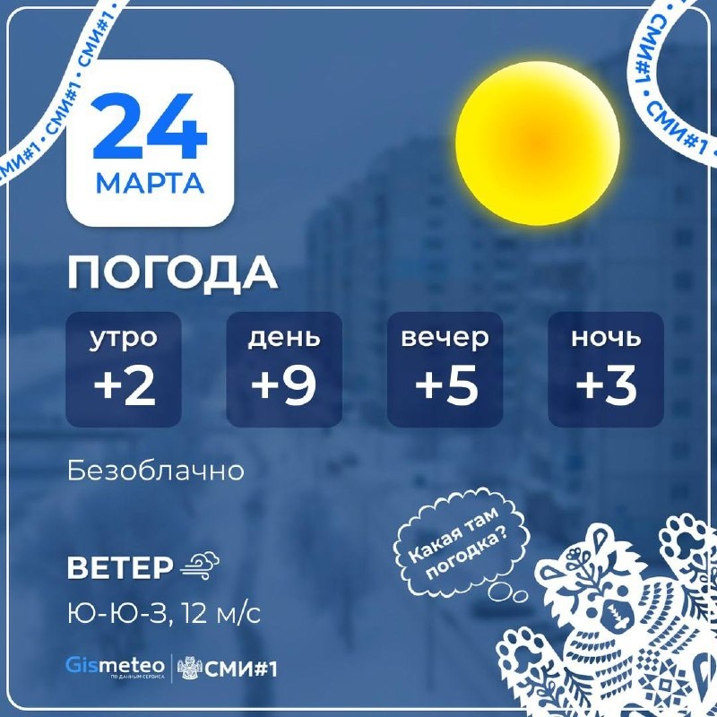 Сегодня синоптики прогнозируют солнечную погоду. Днём ожидается +9°. Вечером похолодает до +5°. Также ожидаются сильные порывы ветра — до 12 м/с. 📲 Читайте нас в MAX 😊 Подписаться | Прислать новость