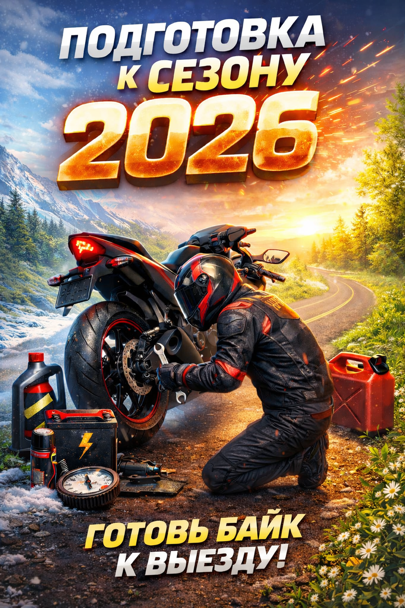 😎 Весна уже на пороге. Пока за окном еще лежит снег - самое время заглянуть в гараж и подготовить свою технику к первому выезду. Немного внимания сейчас - и сезон 2026 начнётся без неприятных сюрпризов. Вот небольшой чек-лист, который стоит пройти перед первой поездкой: 🔧 Осмотр техники Начните с простого - внимательно осмотрите мотоцикл, мопед или скутер. Нет ли подтёков масла, повреждений проводки, ослабленных болтов или ржавчины после зимнего хранения. 🛢 Масло Если масло давно не менялось - лучше заменить его перед сезоном. Свежая смазка поможет двигателю работать мягче и прослужить дольше. 🔋 Аккумулятор Зимой батарея часто разряжается. Проверьте заряд, очистите контакты и при необходимости поставьте аккумулятор на зарядку. 🛑 Тормоза Перед выездом обязательно проверьте тормозные колодки и уровень тормозной жидкости. Тормоза должны срабатывать чётко и без задержек. ⚙️ Цепь Цепь нужно очистить, смазать и проверить натяжение. Это напрямую влияет на плавность езды и ресурс трансмис