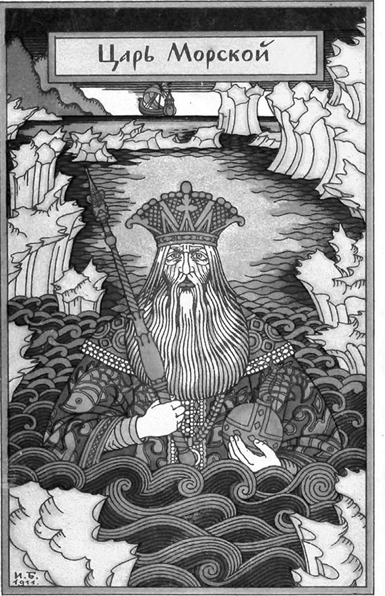 Владычество над морями препоручили идолопоклонствующие славяне особенному божеству, назвав его царем морским. Будучи столько же древен, как и самое море, имеет венец из морского папоротника; разъезжает по морям в раковине, везомой морскими псами; в одной у него руке весло, знак укрощения волн, в другой же острога, знак их возбуждения. Обиталище его во глубине океяна, где чертоги и престол так изображены г. Ломоносовым: