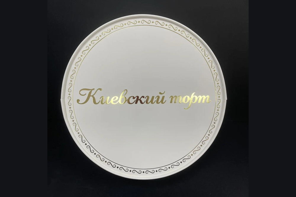 #Кейс «Киевский торт» — это не просто кондитерское изделие. Это имя, история, ожидание. И упаковка для него должна была соответствовать этому статусу. Производитель кондитерских изделий премиум-класса поставил перед нами чёткую задачу: создать торговую круглую коробку диаметром 240 мм, которая подчеркнёт традиционность продукта, обеспечит надёжную защиту торта и станет идеальным элементом презентации в магазинах. 🖌Дизайн вдохновлён украинской выпечкой: элегантная орнаментальная рамка по краю крышки в традиционном стиле задаёт тон утончённости. Центральный логотип «Киевский торт» — шрифт с засечками, который передаёт аутентичность и историю продукта. ✔️Материал: белый плотный картон с гладкой поверхностью ✔️Золотое тиснение фольгой: роскошный блеск на логотипе, который сразу приковывает взгляд ✔️Матовая ламинация: бархатистый тактильный эффект и защита от повреждений Мы разработали несколько вариантов орнаментальной рамки, чтобы добиться идеальных пропорций — красиво, но без перегруза.