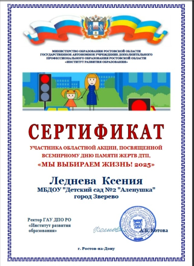 Воспитанники старшей группы «Ягодка» детского сада «Алёнушка» приняли участие в областной акции «Мы выбираем жизнь!», посвященной Всемирному дню памяти жертв дорожно-транспортных происшествий. Участники акции под руководством воспитателя Юлии Чумаковой успешно справились с заданиями организаторов акции. Победителями акции стали Ксения Леднева и Василиса Журавлёва. А воспитанник старшей группы «Ягодка» Евгений Забарный принял участие в III Всероссийском конкурсе стихов и песен «Азбука безопасности дорожного движения» и был удостоен сертификата организаторов. А ранее в старшей группе «Ягодка» детского сада «Алёнушка» города Зверево прошло занятие, посвященное экспериментированию. В этот день воспитатель Юлия Чумакова рассказала малышам об агрегатных состояниях воды и ее круговороте в природе. Дети узнали о том, чем отличается лед от снега, а также получили ответы на вопросы. Еще ребята провели эксперименты со снегом и научились лепить снежки. «Экспериментирование в детском саду может быт
