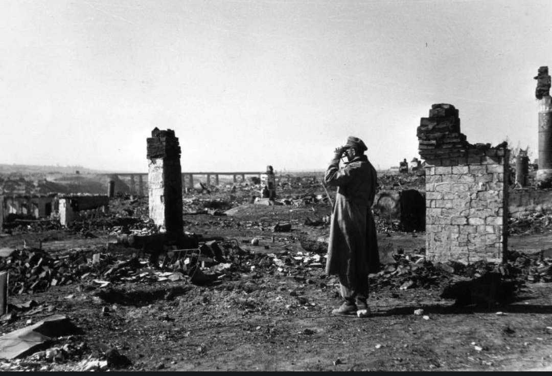 Он смотрит вдаль, полагая, что перед ним — его будущая победа, хотя на деле он видит собственное поражение. Сталинград. Разорённый город, кругом пыль и дым, вместо улиц — груды кирпича. Немецкий офицер убеждён: ещё один шаг, и всё будет окончательно решено. Однако в этих обстоятельствах самоуверенность Третьего рейха начала быстро рушиться.