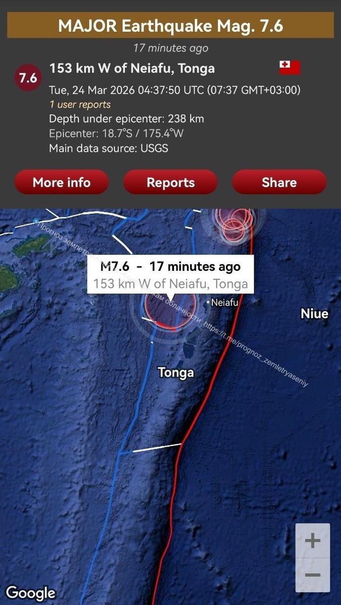 Согласно предупреждению от 18 марта произошло очень сильное землетрясение М7.6 в районе плиты Тонга