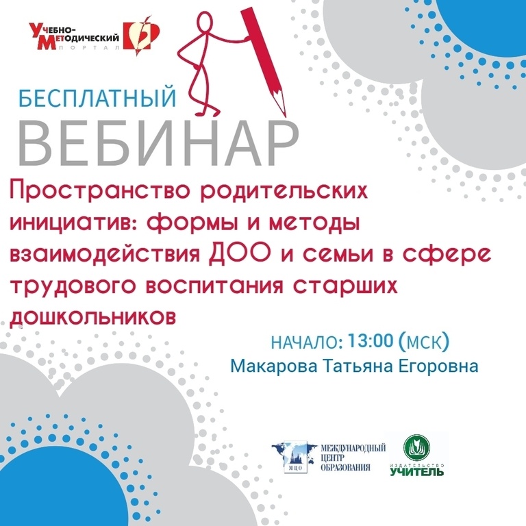 дошкольников» Дата проведения: 25.03.2026 Начало: 13:00 (МСК) https://www.uchmet.ru/events/item/4078707/ На вебинаре слушатели вместе с ведущим познакомятся с инновационными формами и методами взаимодействия ДОО и семьи в сфере трудового воспитания старших дошкольников. На вебинаре будут рассмотрены следующие ВОПРОСЫ: - Цели, задачи, формы, методы и средства трудового воспитания старших дошкольников посредством взаимодействия ДОО и семьи воспитанников. - Активные формы и методы включения родителей в планирование и реализацию АДОП «Мастерская Мудрых Дел: развитие трудолюбия и финансовой смекалки у дошкольников». - Опыт взаимодействия воспитателя в СП «Детский сад «Березка» ГБОУ СОШ № 1 п. г. т. Безенчук Самарской области с родителями по трудовому воспитанию дошкольников: организация и проведение в рамках тематической недели «Промыслы народов России» мастер-класса «Мир ремёсел России». Ведущий вебинара: Макарова Татьяна Егоровна, кандидат педагогических наук, доцент, Почетный работник