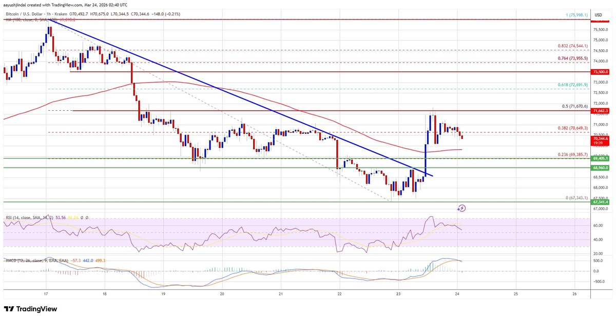 📈 Цена Bitcoin столкнулась с сопротивлением около отметки $71,500, а восстановление от $68,000 может угаснуть. BTC торгуется выше $70,000, но испытывает трудности с дальнейшим ростом в краткосрочной перспективе, особенно если не сможет преодолеть $71,500 и $72,000. 📊 Ключевые моменты: - Цена BTC находится выше $70,000 и 100-часовой простой скользящей средней. - Преодолена медвежья линия тренда с сопротивлением на $69,500. - Ближайшее сопротивление: $71,650, ключевое сопротивление: $72,000. - Важные уровни поддержки: $70,000, затем $69,350 и $68,950. - Индикатор MACD теряет темп в бычьей зоне, RSI выше 50. ⚠️ Риски: Если Bitcoin не сможет преодолеть $71,650, возможно новое снижение к $68,000 и далее к $67,500. Горизонт: краткосрочно