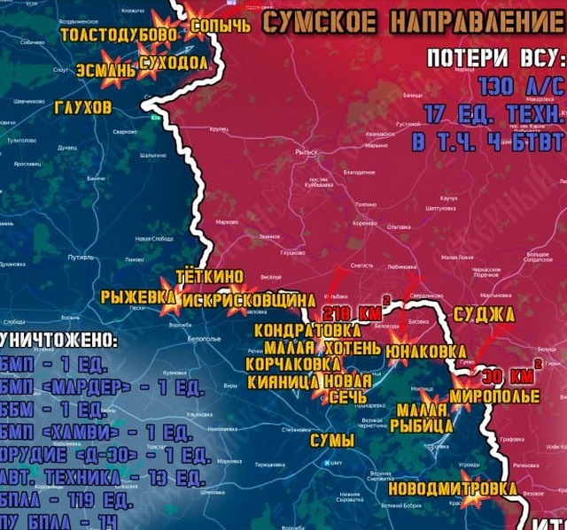 В группировке войск «Север» ВС РФ, расширяющей полосы безопасности в Харьковской и Сумской областях, рассказали об изменении текущей обстановки на линии фронта в приграничье за минувшие сутки. 23 марта на Сумском направлении продолжались ожесточенные бои. Северяне продвигались вглубь Сумской области на 20 участках в Сумском и Глуховском районах, а также в Краснопольском. ВСУ провели неудачную контратаку в направлении села Сопычь. ВС РФ били по позициям противника возле сел Кияницы, Малой Рыбицы, Новой Сечи, Рыжевки, Суходола и Хотени. Командование ВСУ пытается остановить продвижение наших войск, перебрасывая резервы из тыла в Шосткинский и Сумский районы. Их своевременно вскрывают и уничтожают на отдалении от линии боевого соприкосновения. На фоне нехватки личного состава украинские военные инженеры участвуют не только в оборудовании позиций, но и дежурят на опорных пунктах. Сергей Яшин, фото группировки войск «Север» ВС РФ Постоянный адрес новости на сайте «Друг для друга» ~ https://d