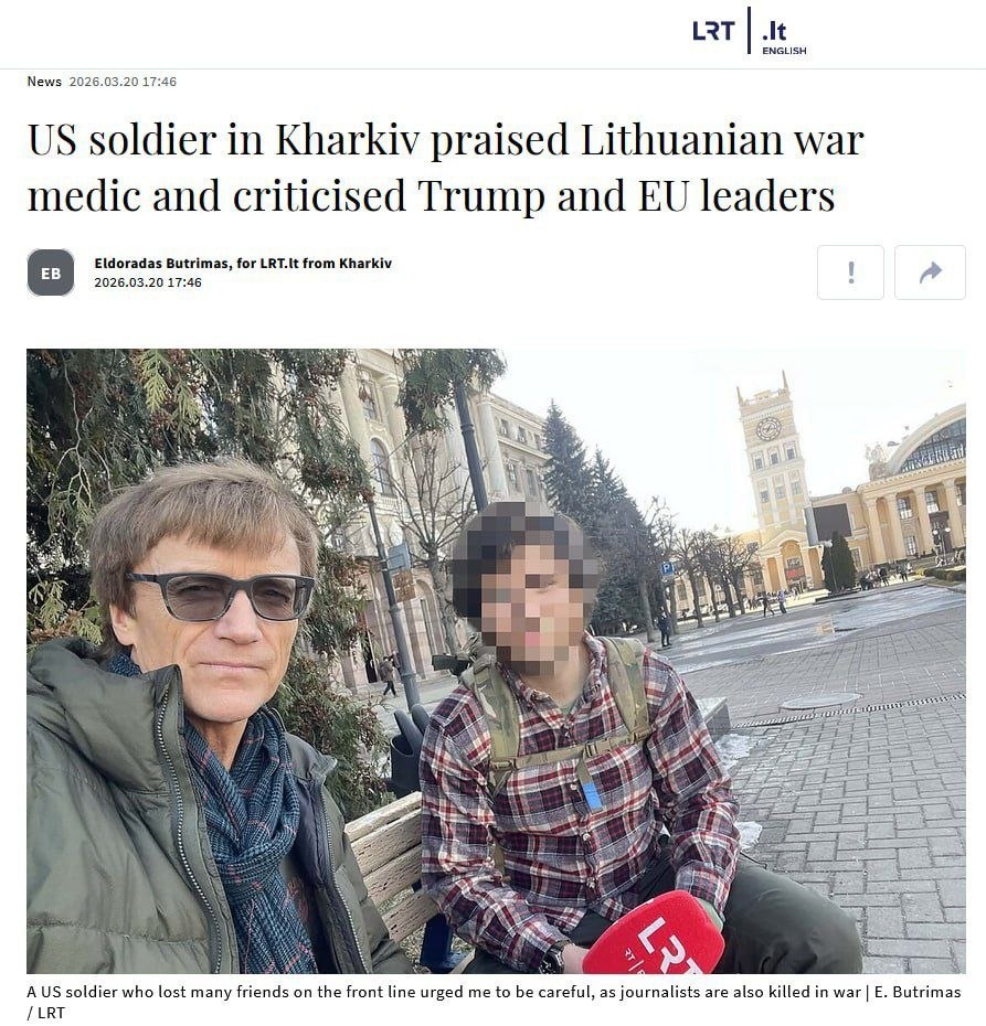 В прибалтийских СМИ неожиданно признали участие кадровых литовских военнослужащих в конфликте на Украине. Так, литовский журналист взял интервью у американского наёмника, находящегося в Харькове, который вспомнил, что пересекался в зоне боевых действий с военнослужащим из Литвы. Также наемник из США подтвердил колоссальные потери среди своих "побратимов". Многие мои друзья были ранены, а некоторые погибли. Из иностранцев, с которыми я тренировался, когда только приехал на Украину (в 2025 году), в живых не осталось почти никого. - жалуется наемник. Присоединяйтесь 👇 https://geochronic.ru 👍Хроники Геополитики👍