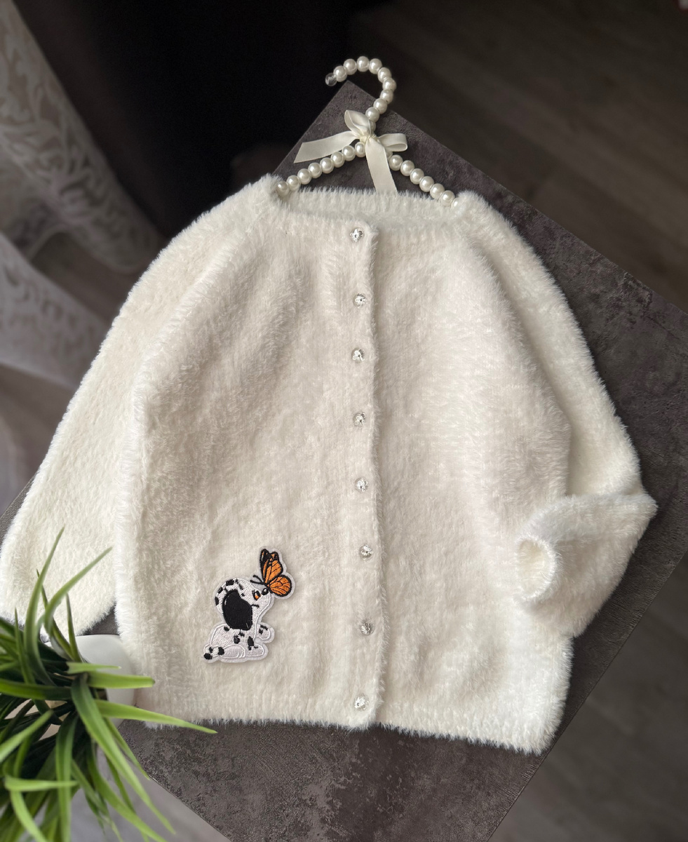 Посмотрите на фото готового кардигана — пушистый белый вариант с милыми декоративными элементами. Разве не очаровательно? 😍 Представьте, как будет радоваться ваша малышка, надевая такой наряд на весенние прогулки!