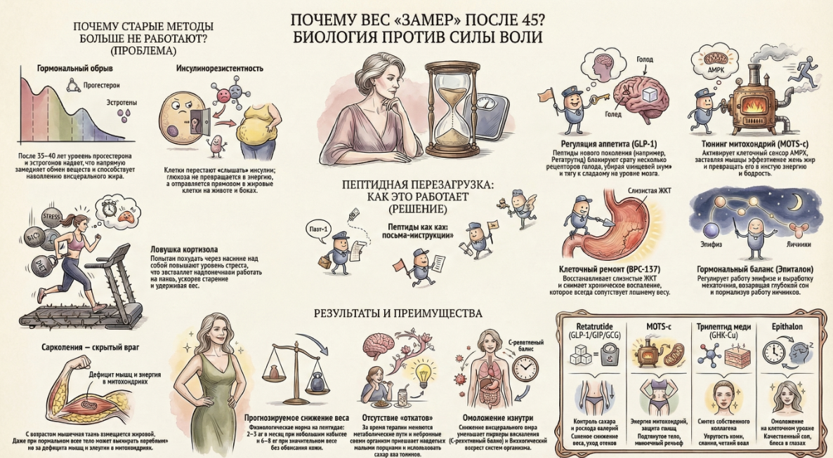 Обычные ограничения только усугубляют стресс и замедляют метаболизм еще сильнее. Современный подход - это «перепрошивка» метаболических путей. Сегодня медицина использует пептидную терапию (например, препараты группы GLP-1), чтобы: Важно: Чтобы худеть без «оземпик-лица» и обвисания кожи, необходимо параллельно закрывать дефициты белка и использовать пептиды-помощники (такие как GHK-Cu или MOTS-c), которые поддерживают тонус мышц и тургор кожи. Старость и лишний вес - это не неизбежность, а результат накопленных поломок в организме, которые сегодня можно и нужно исправлять.