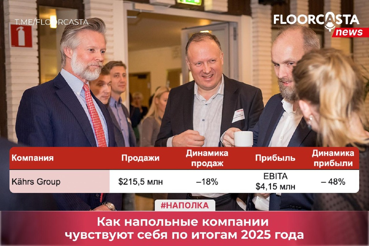 Часть 3: Kährs Group – двузначное падение и свет в конце тоннеля 🇸🇪 Шведский производитель деревянных покрытий с историей более 160 лет и поставками почти в 70 стран показал одно из самых глубоких падений среди крупных игроков. Но за общей цифрой скрывается важная региональная динамика. Ключевые цифры 2025 года: ➡️ Продажи: 1,972 млрд шведских крон ($215,5 млн), –18% к 2024. ➡️ Органическое падение (без учёта валюты и продажи бизнеса в России): –8%. ➡️ Операционная прибыль (EBIT): 20 млн крон ($2,16 млн), –63%. Ключевые цифры IV кв. 2025 года: ➡️ Продажи: -15% (органически –2%) ➡️ Операционная прибыль (EBIT): –14 млн крон ($1,51 млн) 📊 География продаж 2025: Европа (non-Nordics) — 33%, Скандинавия (Nordics) — 47%, Северная Америка — 15%, APIM (Азия, Бл. Восток) — 5%. 📝 Справочно: В России компания представлена под брендами Karelia, Upofloor, Polarwood, Focus Floor, DuoWood и Kährs. ✍️ В целом, общая цифра –18% обманчива. Компания показывает рост в ключевых европейских экономи
