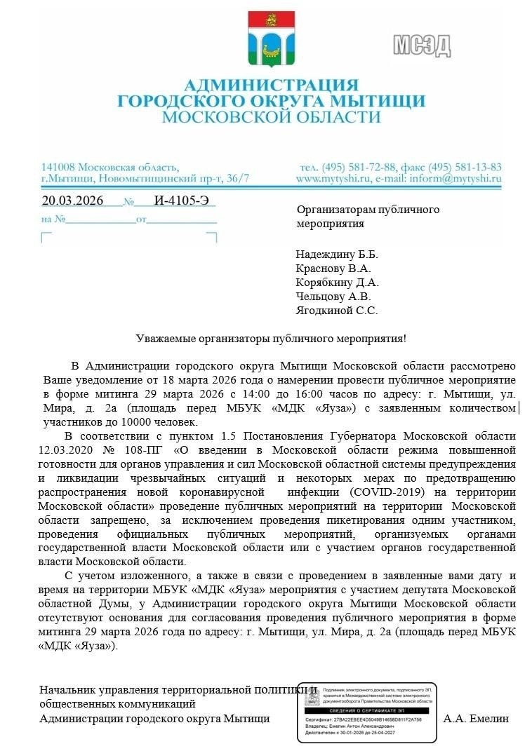 В Красногорск, Долгопрудный, Королев, Мытищи и Химки были направлены запросы на проведение массовых мероприятий против блокировки интернета и мессенджеров от команды экс-кандидата в президенты Надеждина. Также его сторонники подавали заявления и в других городах в Московской области. Во всех случаях активистам пришел отказ в связи с «Ковидом». При этом 19 марта, в день подачи заявлений командой Надеждина, в Мособлдуме обсуждался вопрос актуальности ковидных ограничений. Председателя Общественной палаты Московской области попросили снять данные запреты, а он ответил, что был «не в курсе» о их действии в настоящий момент. В Москве митинг ранее тоже не согласовали из-за ковидных ограничений. 🚀 Telegram канал Дрожжино 🚀 Telegram ЧАТ Дрожжино 📱 VK Дрожжино 📲 MAX канал Дрожжино 📲 MAX ЧАТ Дрожжино 💻 ДЗЕН Дрожжино