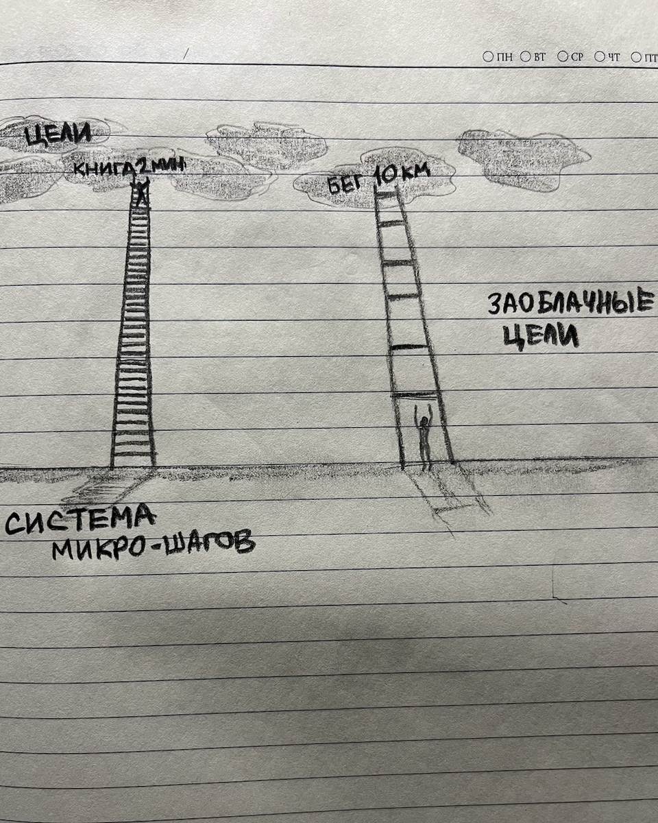 ⏳ Осталось 8 дней. Иногда мы ставим заоблачные цели. И чтобы добраться до таких высоких целей, нужна лестница в небо. Но у одних лестница с перекладинами через каждые 20 см, а у других - через 2 метра. Вы ставите себе задачу: «С завтрашнего дня бегаю по 10 км». До этой перекладины расстояние в 2 метра. Вы стоите внизу, смотрите вверх и… остаетесь на месте. Точно также можно поставить цель, пойти завтра в спортзал и поднять штангу 100 кг, без подготовки. Все же понимают какие будут последствия. Неоднократно упоминал, что система с маленькими шагами работает. Планка 2 минуты. 10 страниц книги. Возьмите свои привычки, которые вы хотите внедрить, но вы или не продолжаете их делать, или даже не начинаете. Сделайте из своей привычки действие в 1-2 шага. Это ступеньки, на которые невозможно не наступить. Секрет не в высоте перекладины, а в доступности следующего шага. Сделайте свои перекладины ниже. Отчет за 23.03.2026