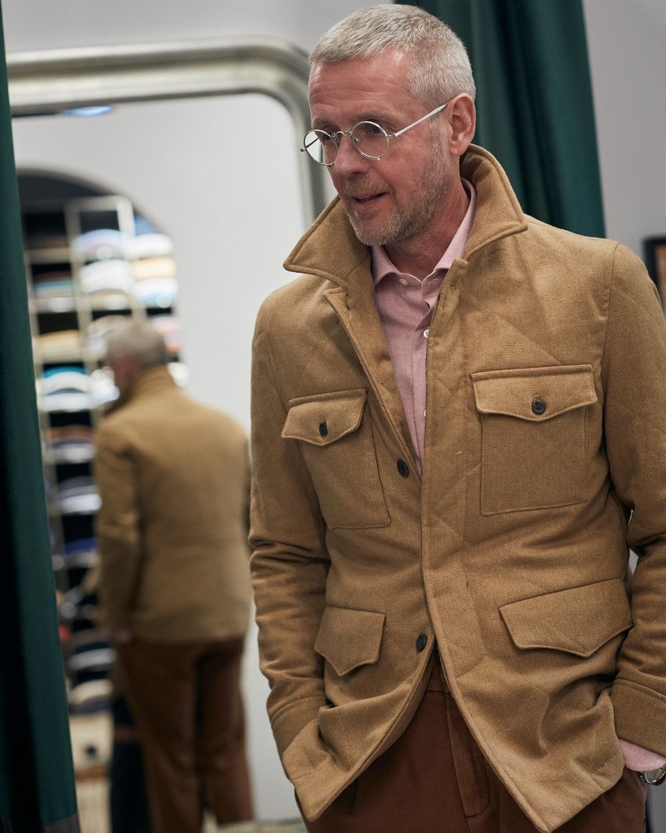 Вещи для этого образа Владимира – стёганка, коньячного цвета брюки, розовая рубашка и яркие duck boots – мягкие по фактуре, но выразительные