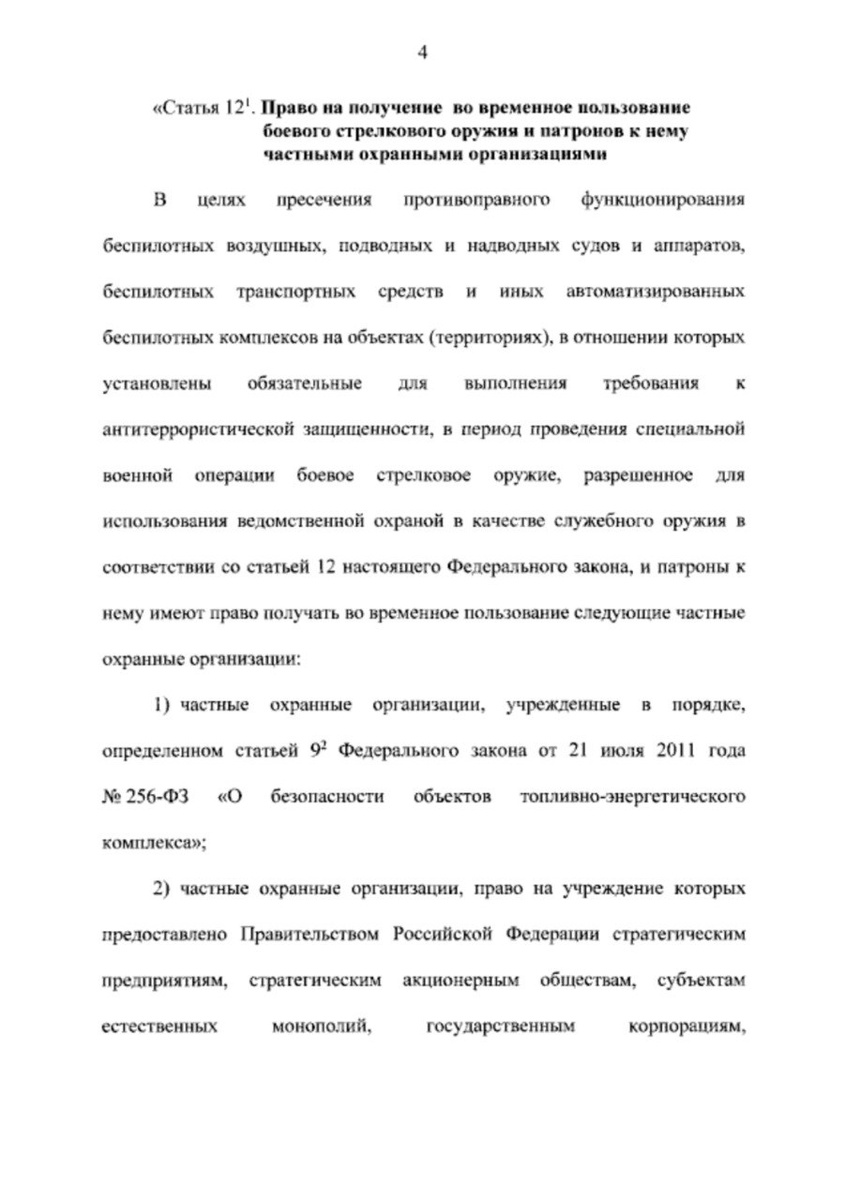 частные охранные предприятия (ЧОП) правом получать от Росгвардии боевое стрелковое оружие для защиты охраняемых объектов от атак дронов. Согласно закону, Росгвардия будет предоставлять ЧОПам оружие и патроны во временное пользование с целью отражения атак беспилотников на определенных объектах. Организации смогут получить оружие на время проведения военной операции. Как пояснил председатель думского комитета по безопасности и противодействию коррупции Василий Пискарев, оружие будет выдаваться для охраны объектов критической инфраструктуры. По его словам, сейчас охрану более 80% объектов ТЭК в России осуществляют именно ЧОПы. Решение, мягко говоря, запоздалое, но введение «объектового ПВО» — это насущная необходимость. Однако, учитывая, что отдельного рода войск, как ПВО, у нас нет и все находится в подчинении ВКС России, будем надеяться, что чиновникам все же удастся согласовать работу военных, ЧОП и гражданской авиации. В противном случае, хаос может быть несустветный.