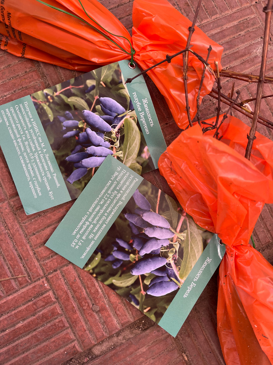 В этот же раз по дороге к кассе наткнулись на большууую коробку с саженцами разнообразными. И цена смешная - 204 рубля за корень. Не цена - сказка! Тут я уж не удержалась, порылась в этой коробке. Саженцы оказались в весьма приличном состоянии. Пришлось брать… Взяла себе два корня жимолости, сорта Баррель и Голубое веретено. У меня в Иркутске росли эти два сорта и по вкусовым качествам меня устраивали.